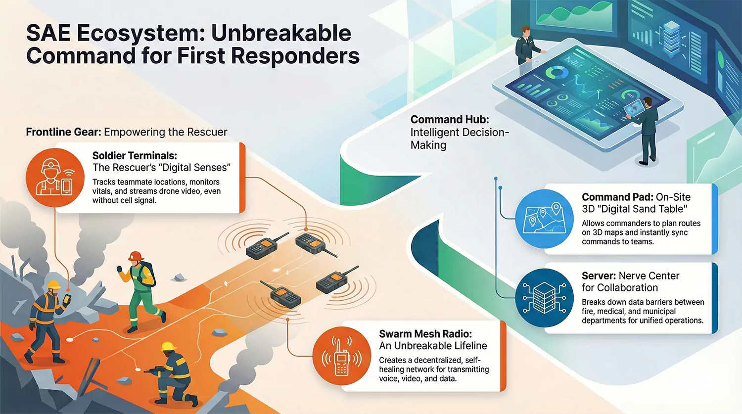 Designed for complex, multi-scenario operations, it reduces on-site chaos and accelerates response times when every second matters. Whether within a single team or across multiple departments, the system enables synchronized, simultaneous action for first responders.